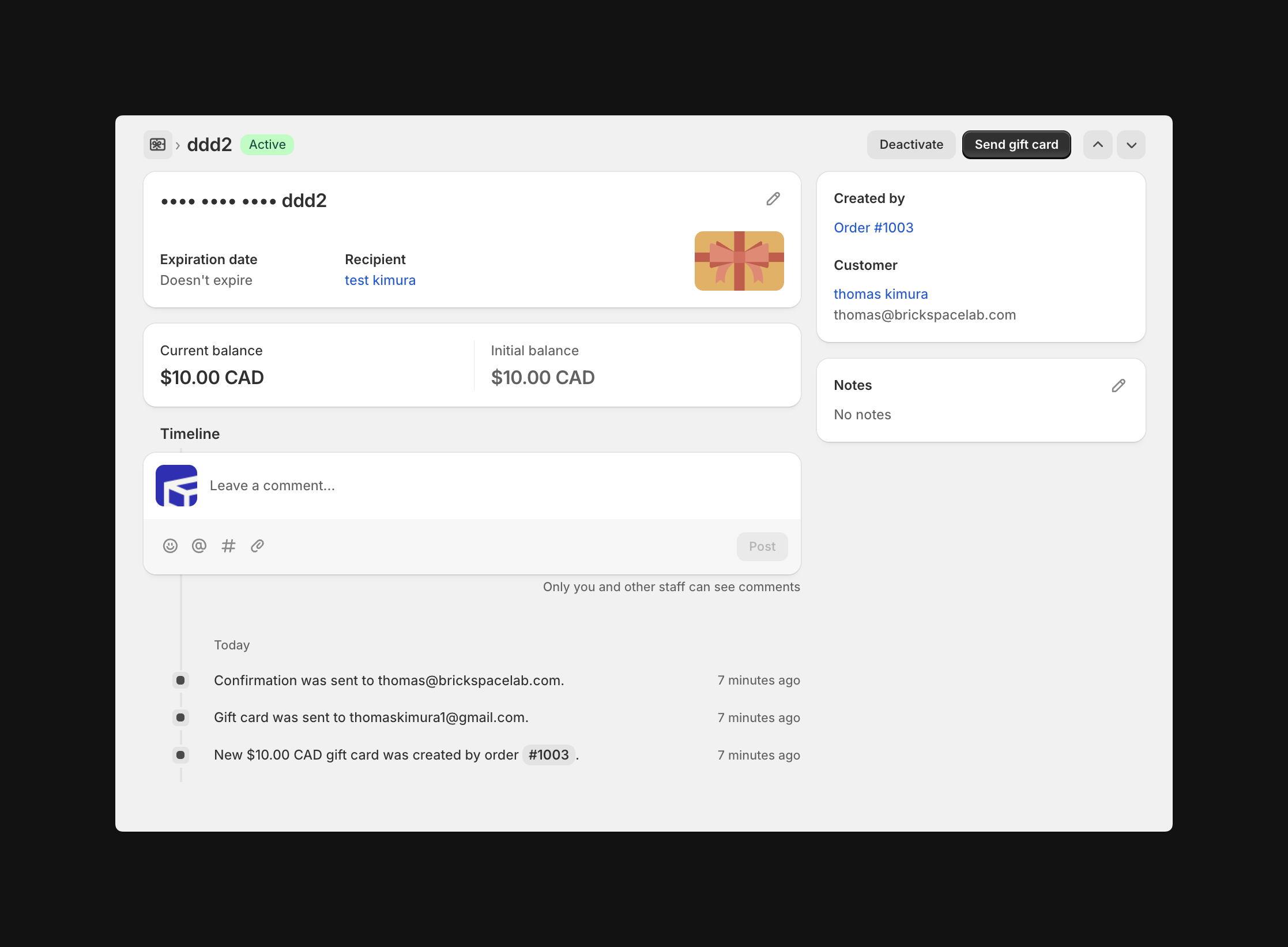 Gift cards will be emailed to your customers only after order notifications are sent. To do this, navigate to an order on your Shopify account with a gift card. Click **Fulfill items**, then select **Send a** [**notification**](https://admin.shopify.com/store/brickspacetestingstore/email_templates/shipping_confirmation/preview) **to the customer**, then click **Fulfill items**<br>